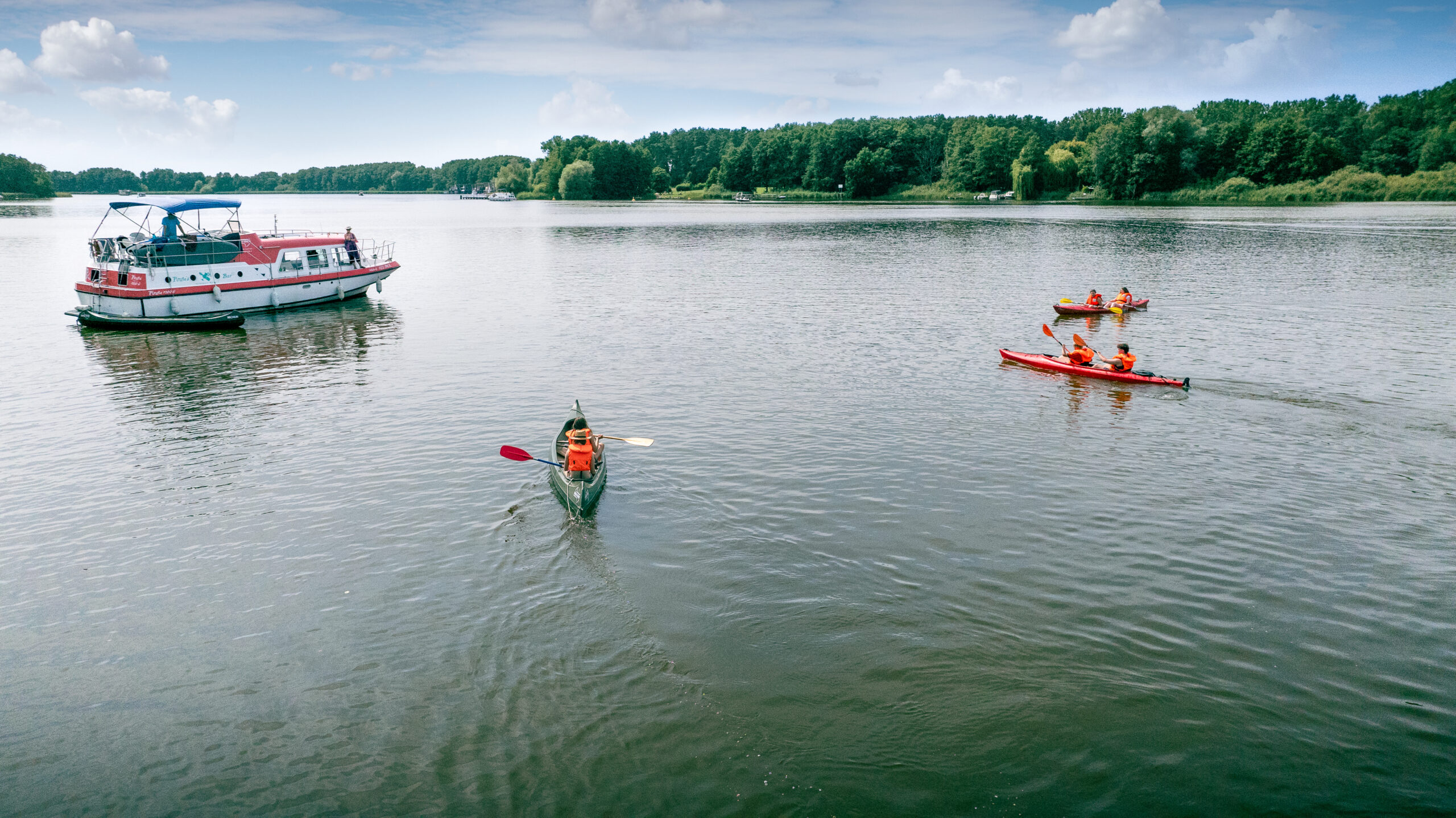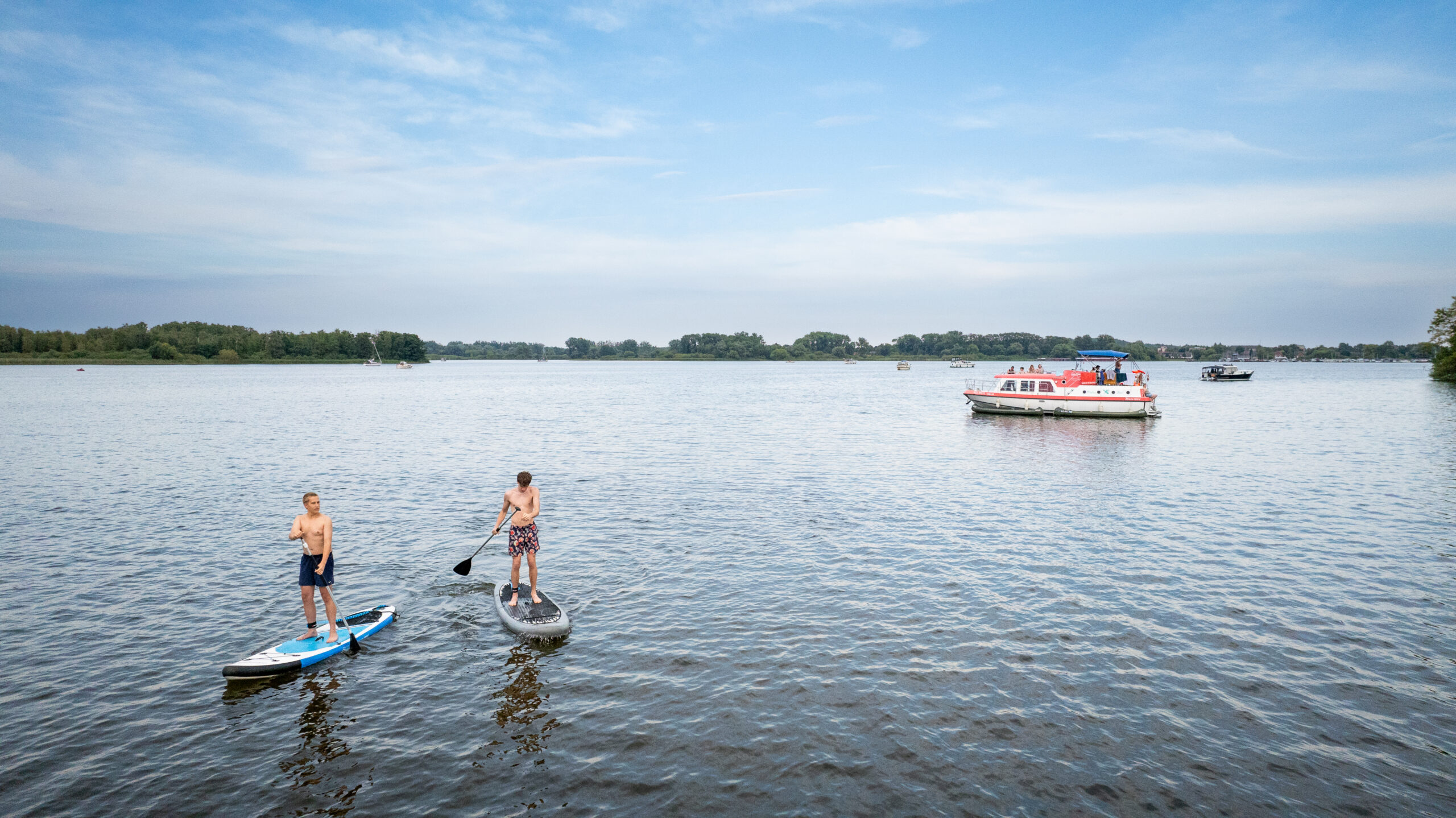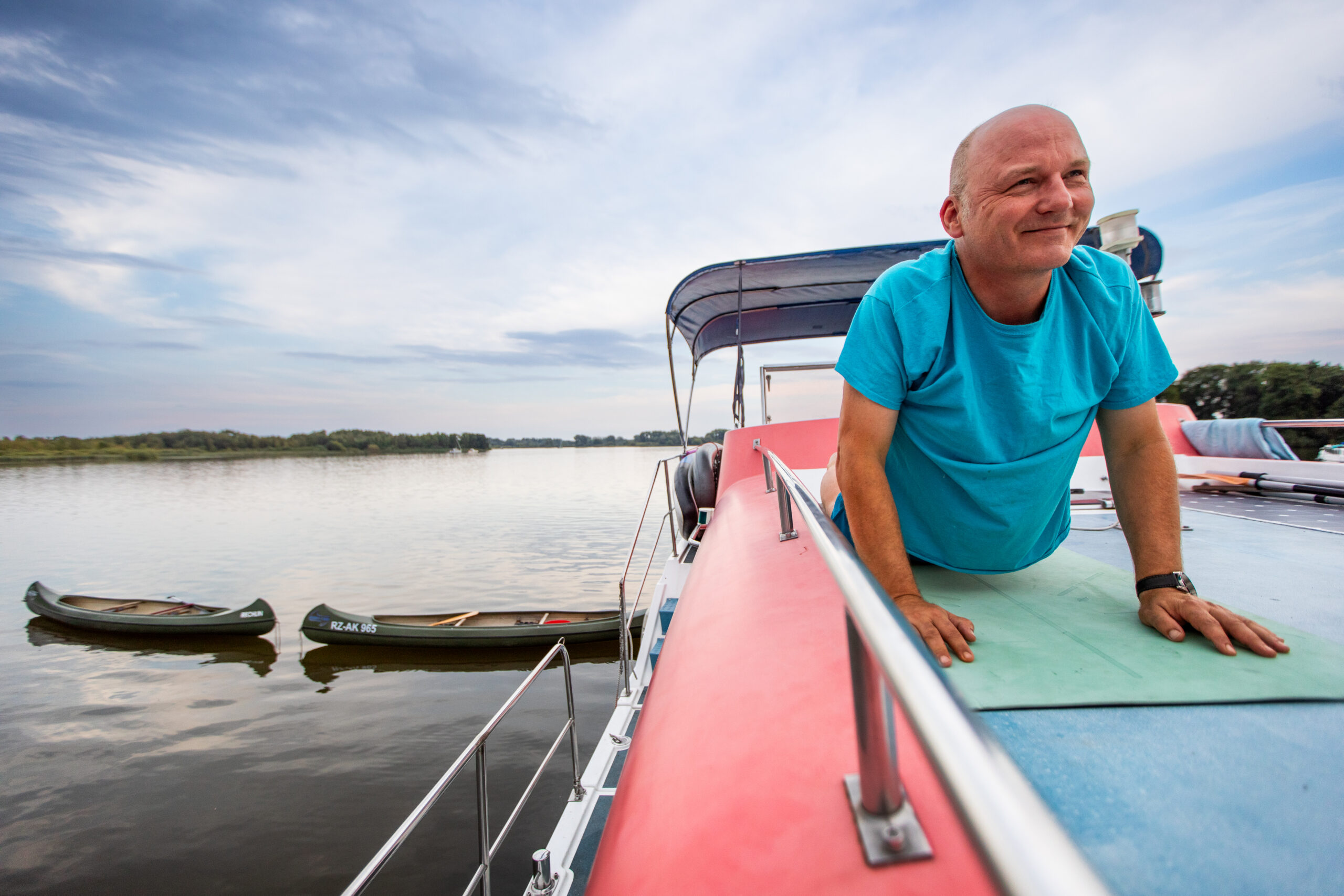 Auch im Bootsurlaub müssen Sportbegeisterte nicht auf Bewegung verzichten. Einige Boote der KUHNLE-TOURS Flotte eignen sich hervorragend zum Transportieren von Fahrrädern und SUPs.  Kanus können unkompliziert hinter dem Boot hergezogen werden und wer ganz ohne Sportgeräte unterwegs ist, kann Yoga und Qigong auch auf dem Hausboot allein und in Gruppen praktizieren. Unsere Reviere bieten abwechslungsreiche Strecken – sowohl Hobbysportler als auch Radprofis kommen auf ihre Kosten.