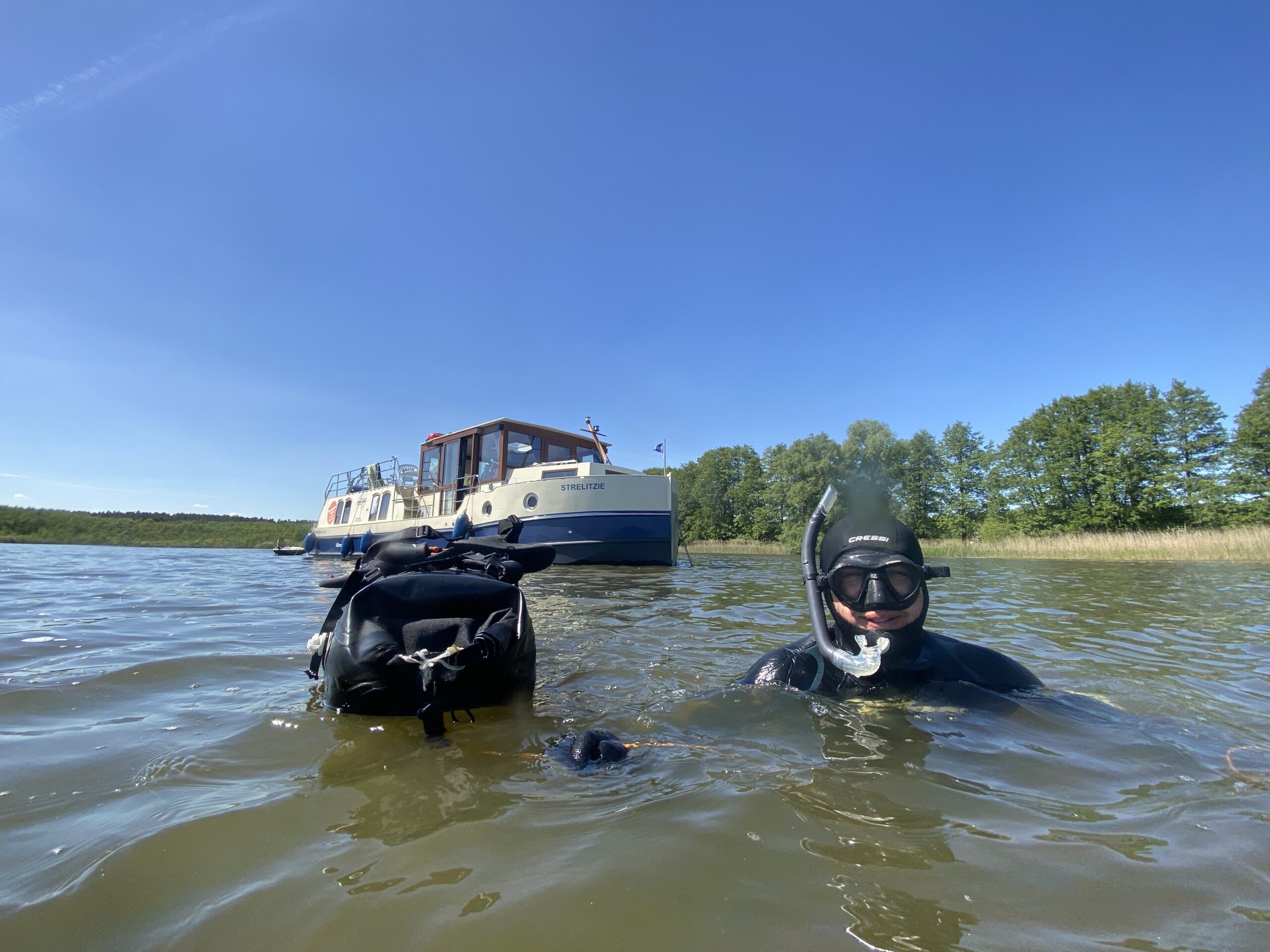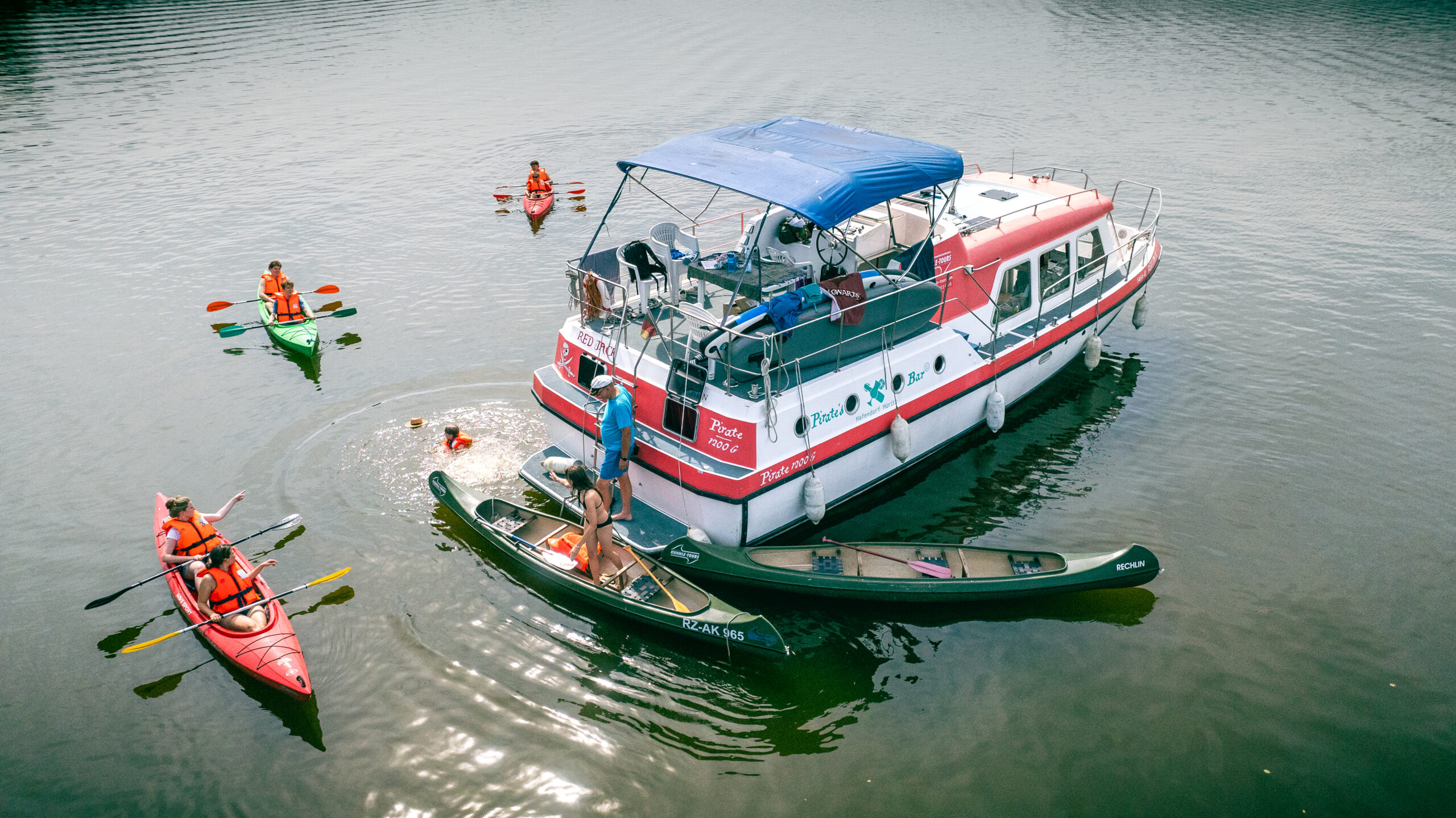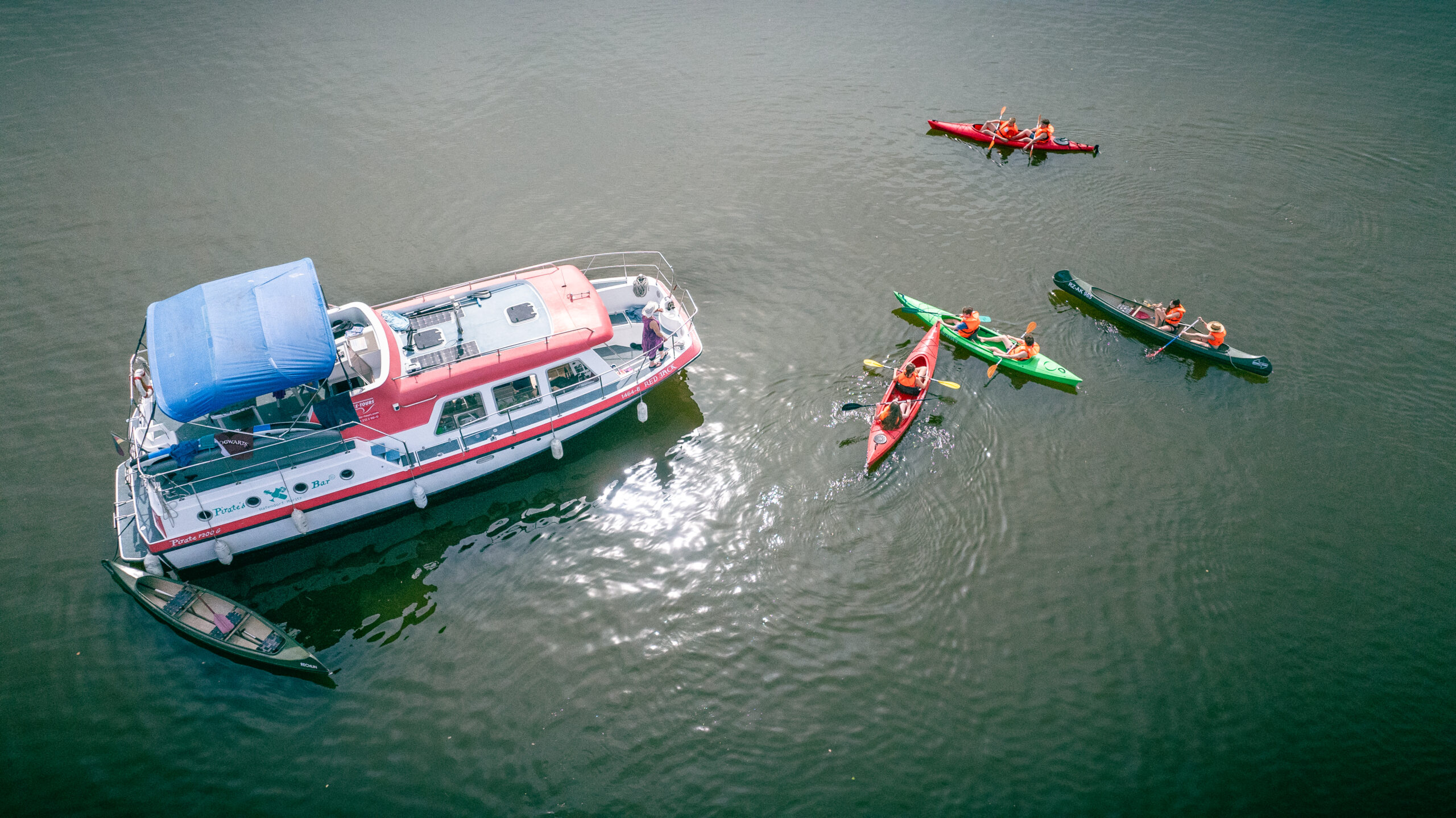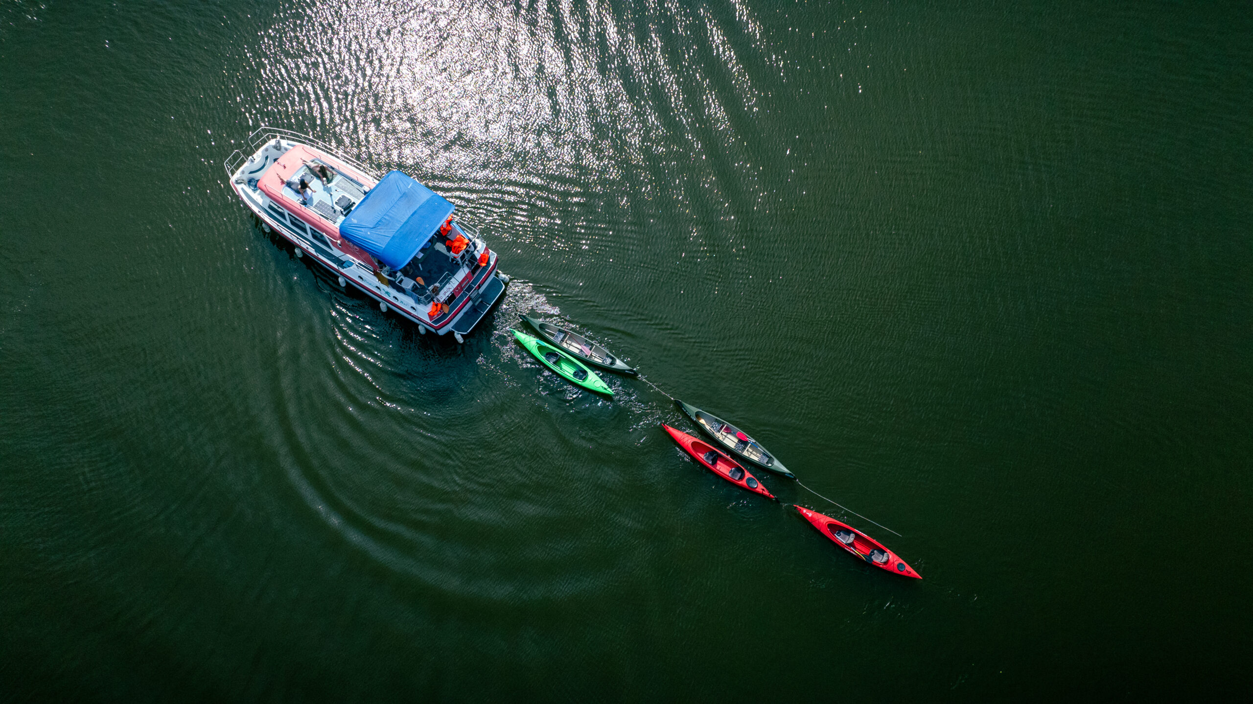 Kanus und SUPs lassen sich auch bequem hinterher schleppen.
