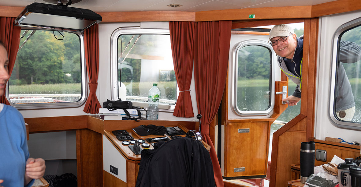 Das ungewöhnlich breite Boot aus der holländischen Aquanaut-Schmiede zieht mit seinem Retro-Look alle Blicke auf sich – ein Hingucker im Stil der berühmten Hamburger Hafenschlepper.