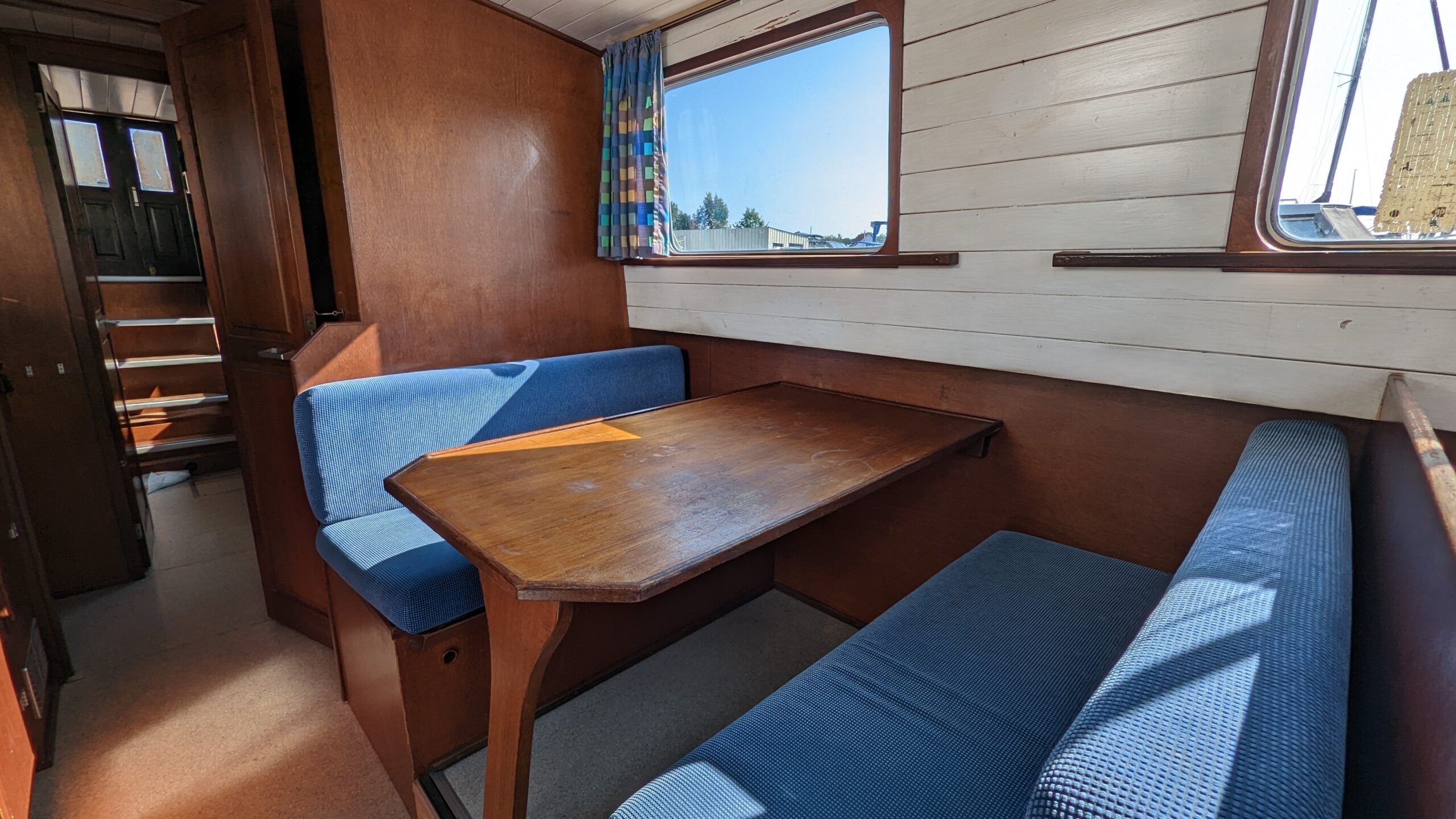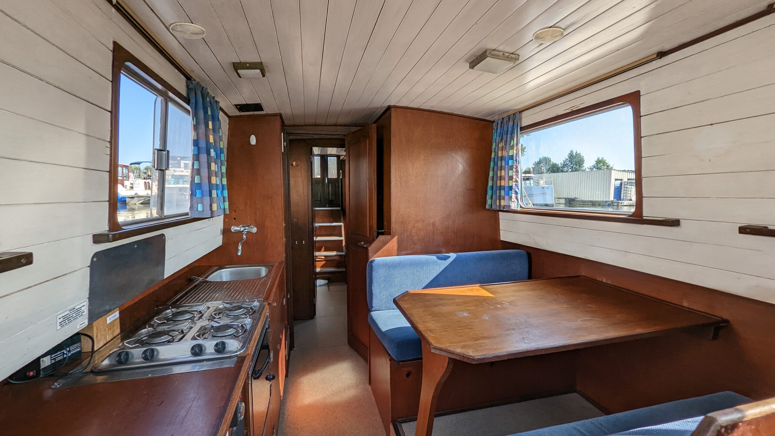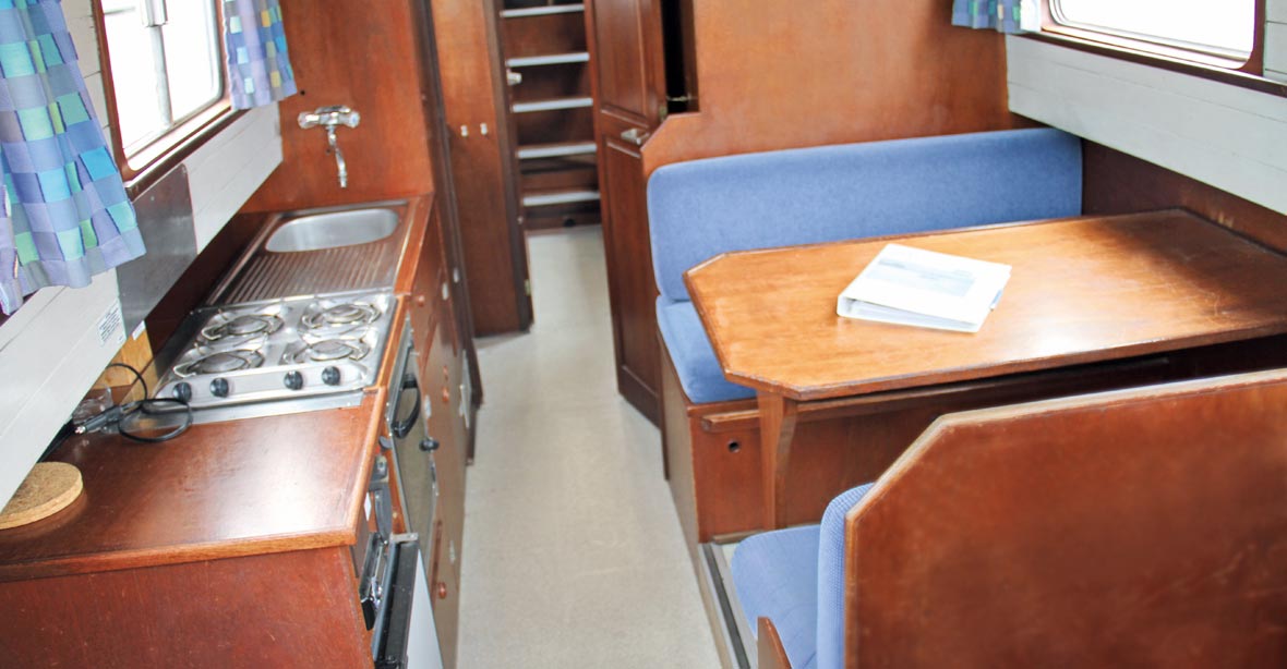 Traditionelles Hausboot im Stil der englischen Narrowboats mit einer einzigen Wohnebene – ideal für Paare und kleine Familien.