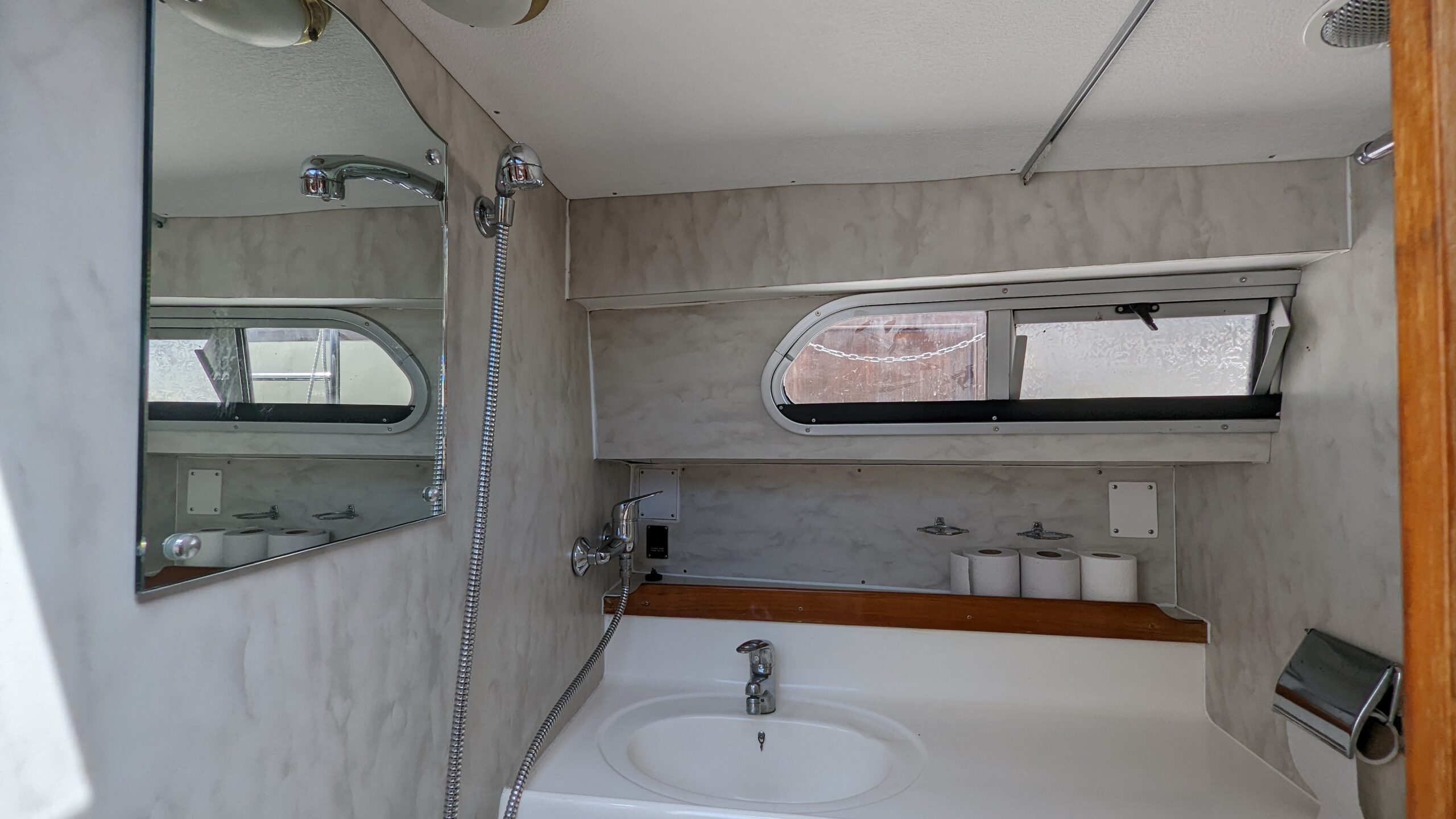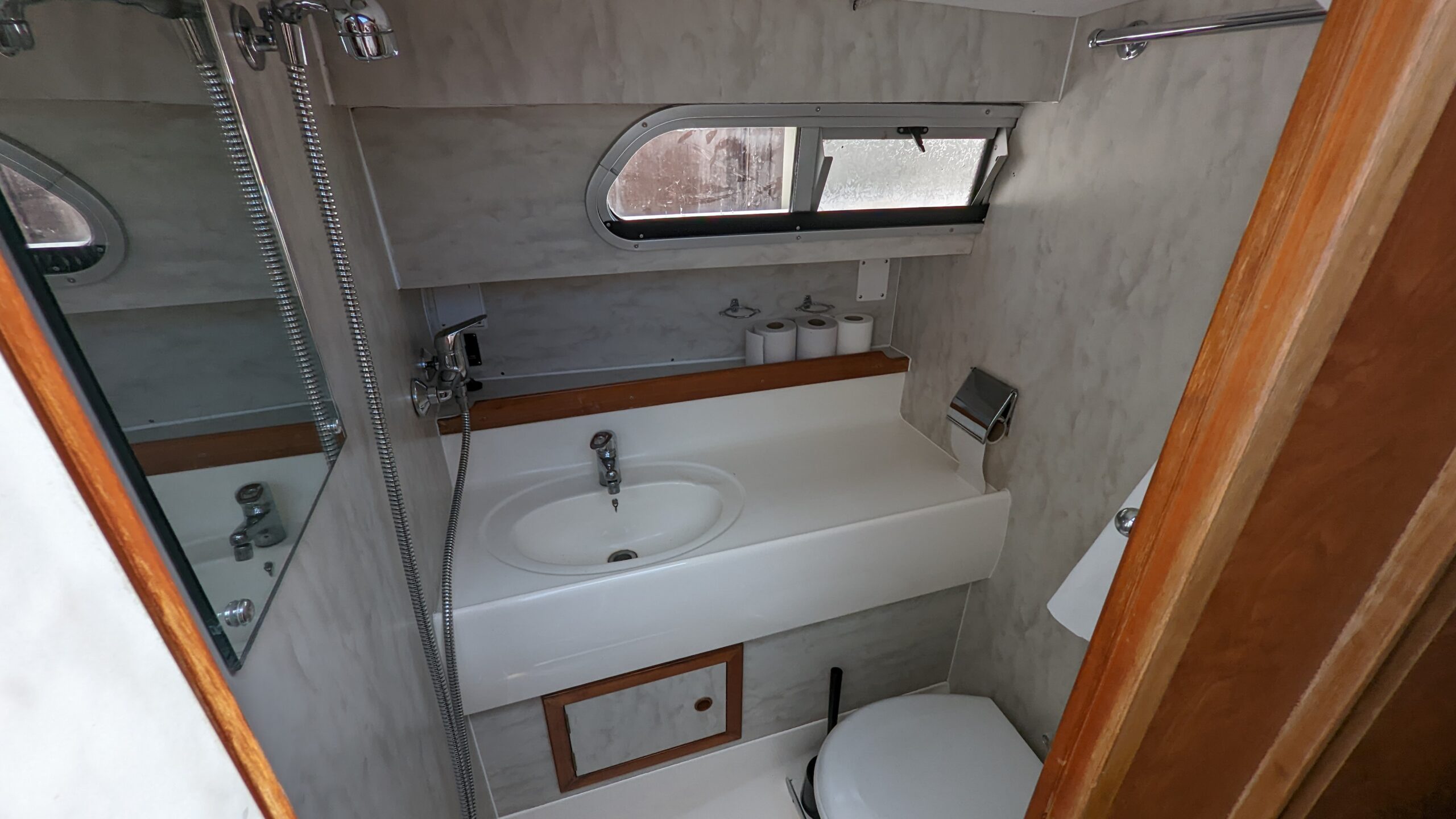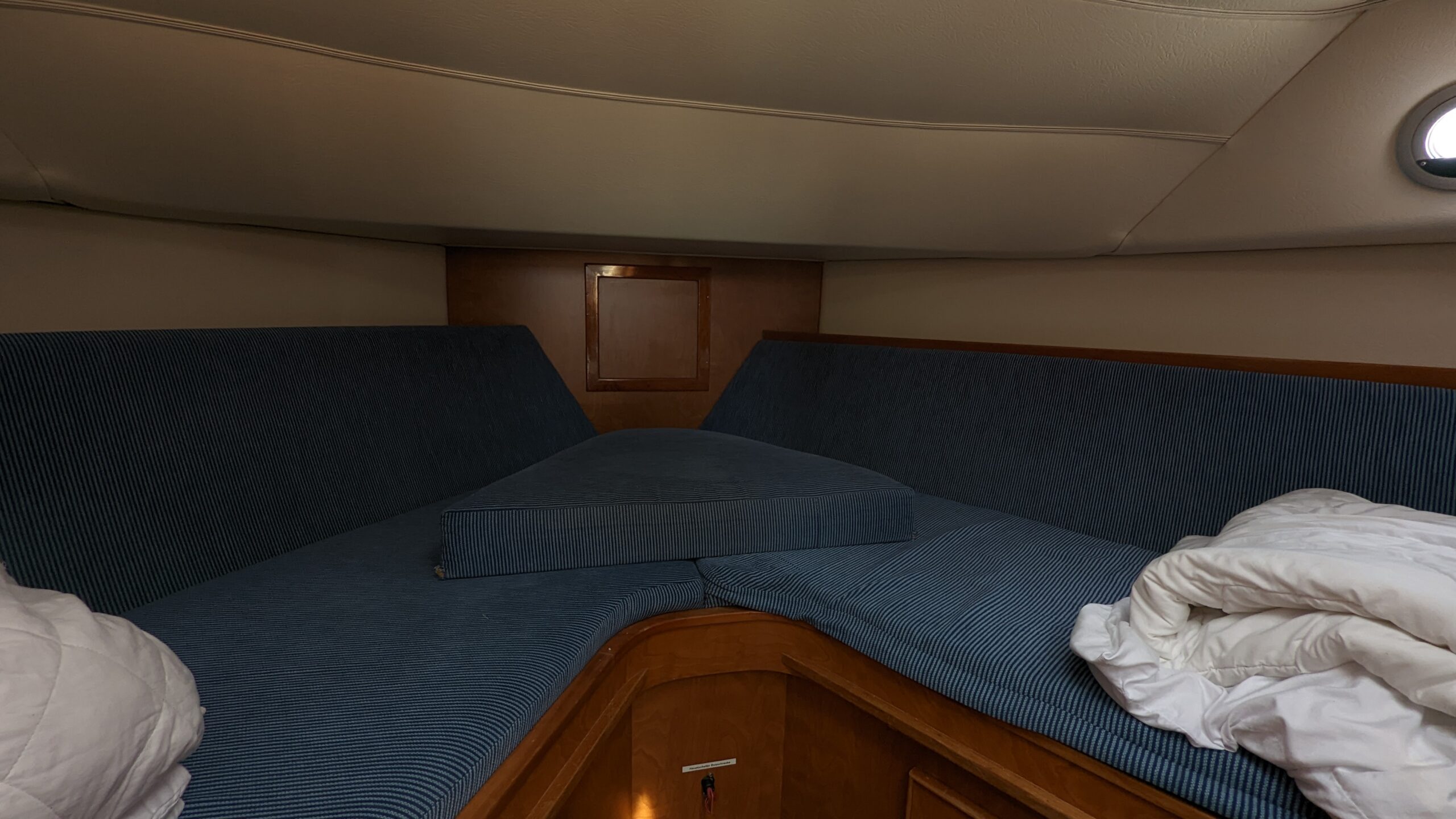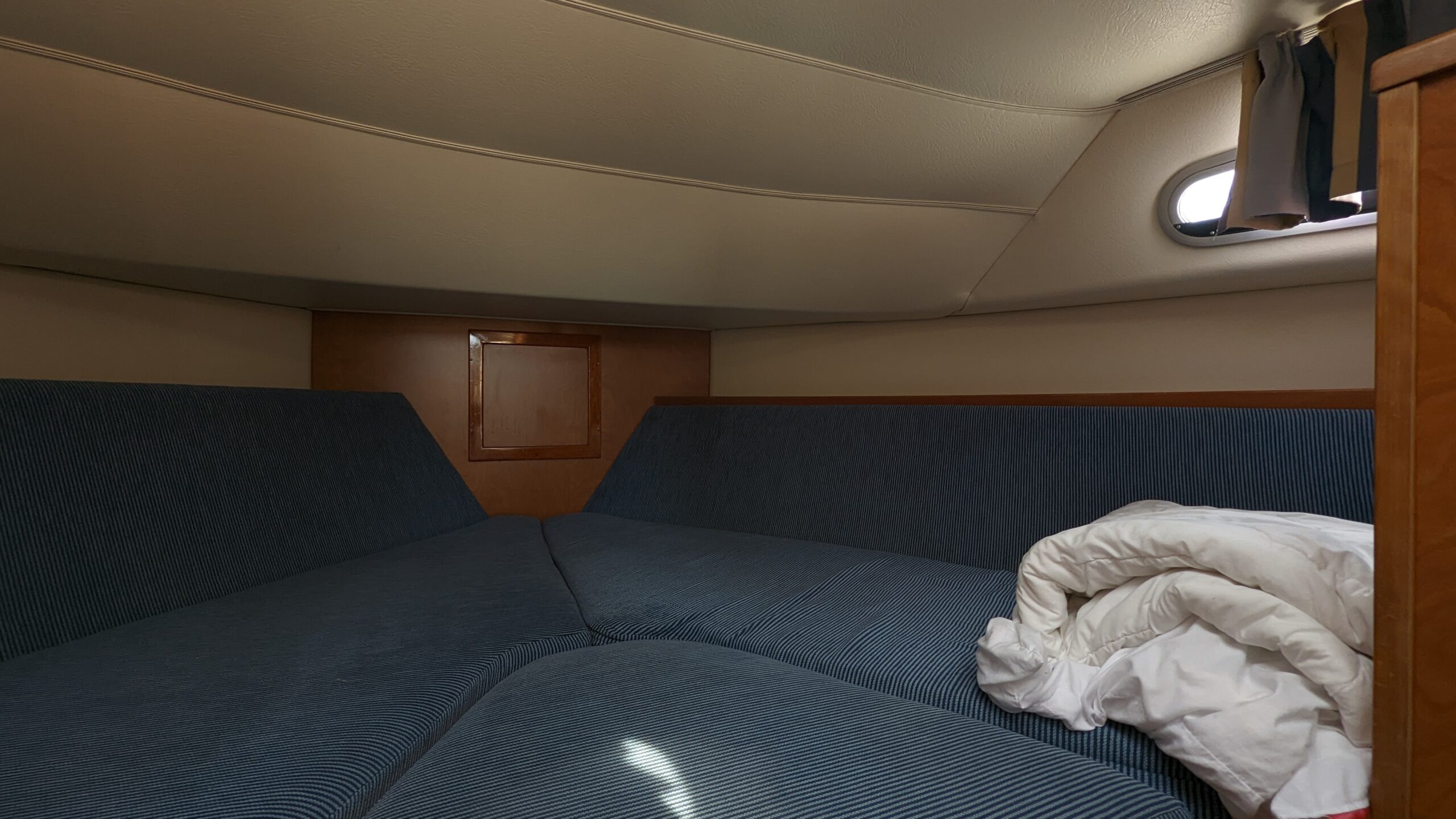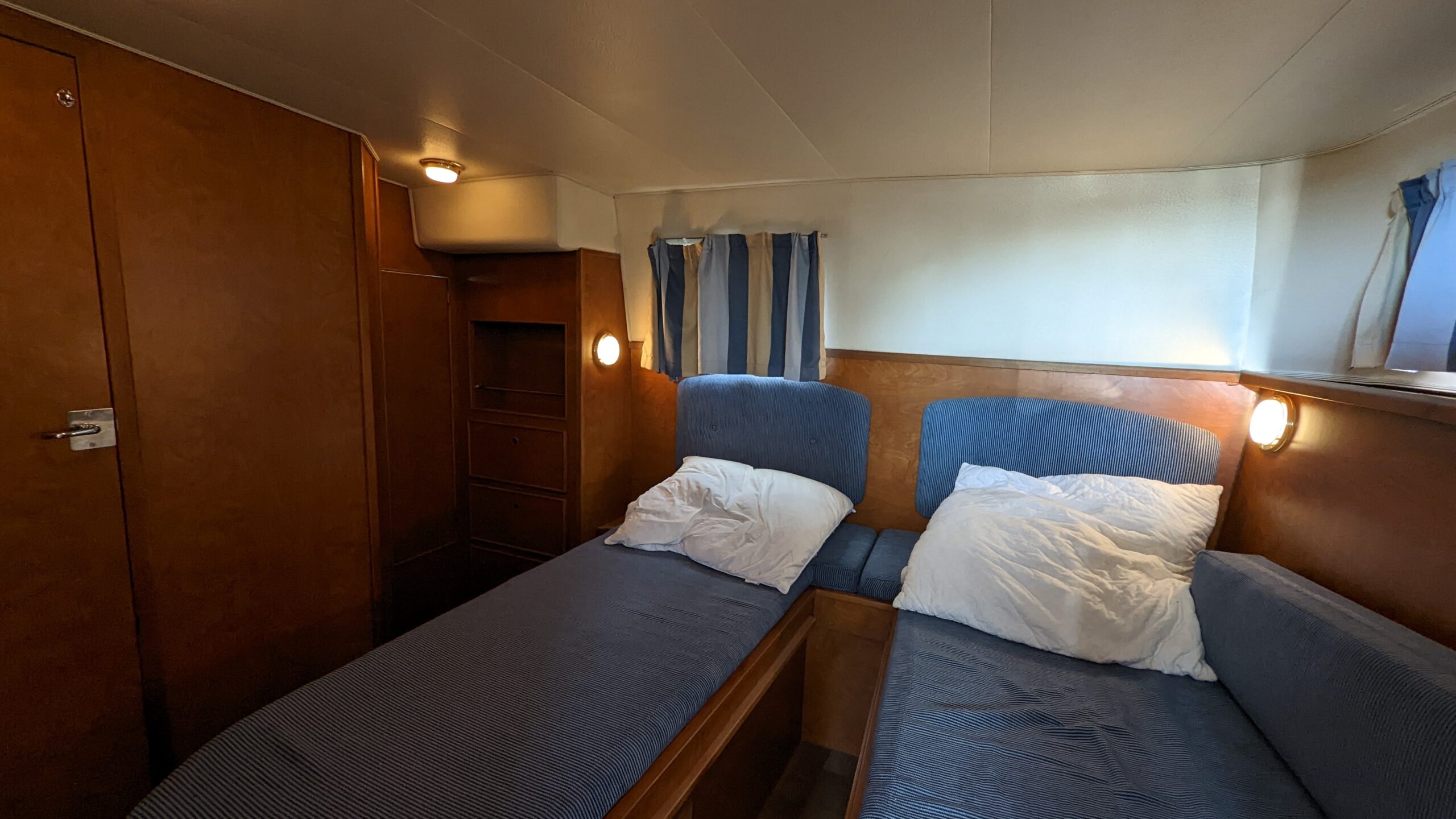 • 2 Kabinen, im Heck Kabine mit Doppelbett oder zwei Einzelbetten, im Bug Kabine mit Doppelbett oder zwei Einzelbetten (Einzelbetten sind mit wenigen Handgriffen zu einem Doppelbett zusammenzuschieben oder als getrennte Betten benutzbar)
