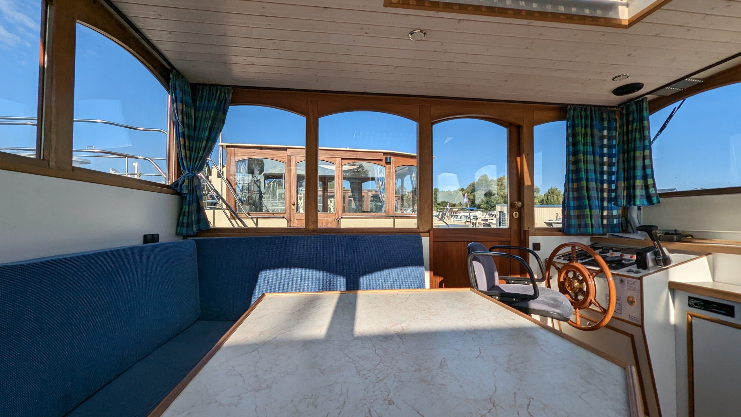 - Innenfahrstand mit höhenverstellbarem Skipper-Sessel und großem Steuerrad