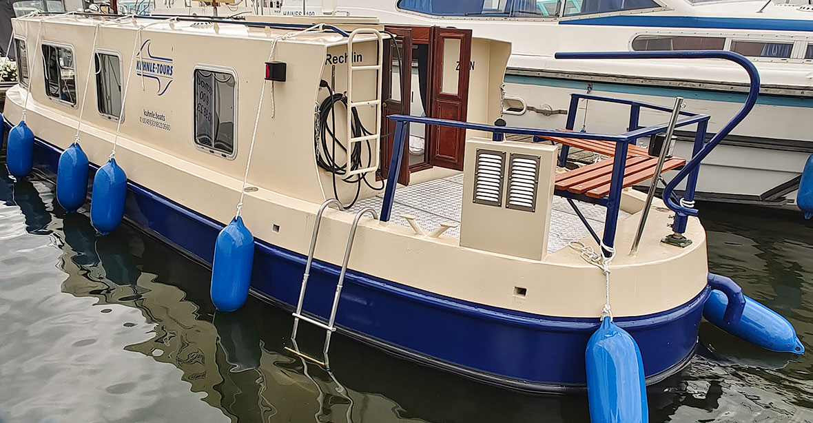 Traditionelles Hausboot im Stil der englischen Narrowboats mit einer einzigen Wohnebene ohne Stufen, einfaches feines Boot für Paare oder kleine Familien.