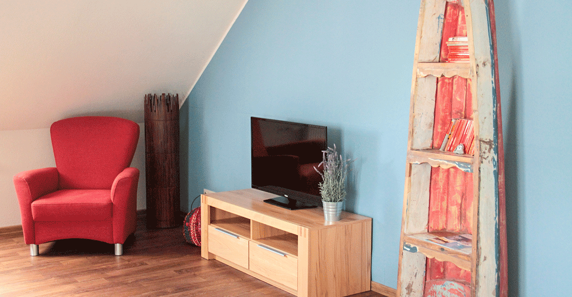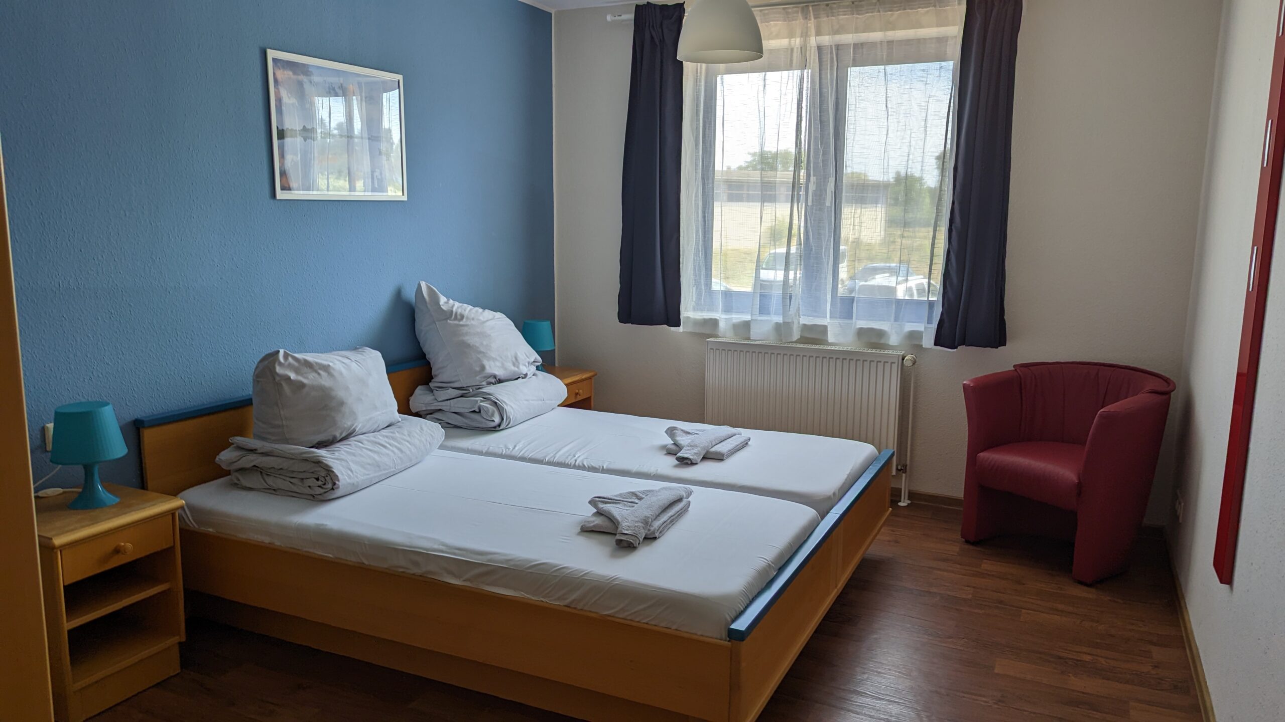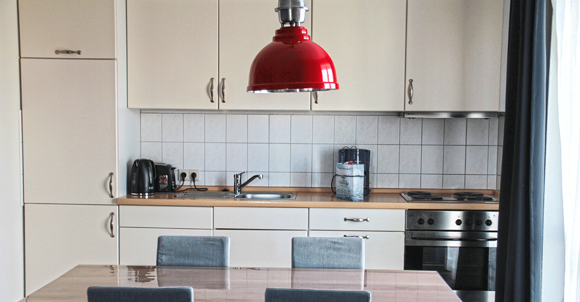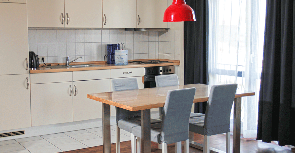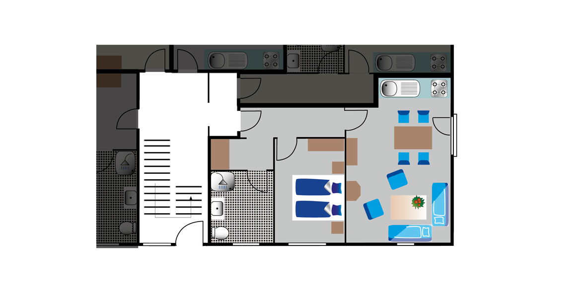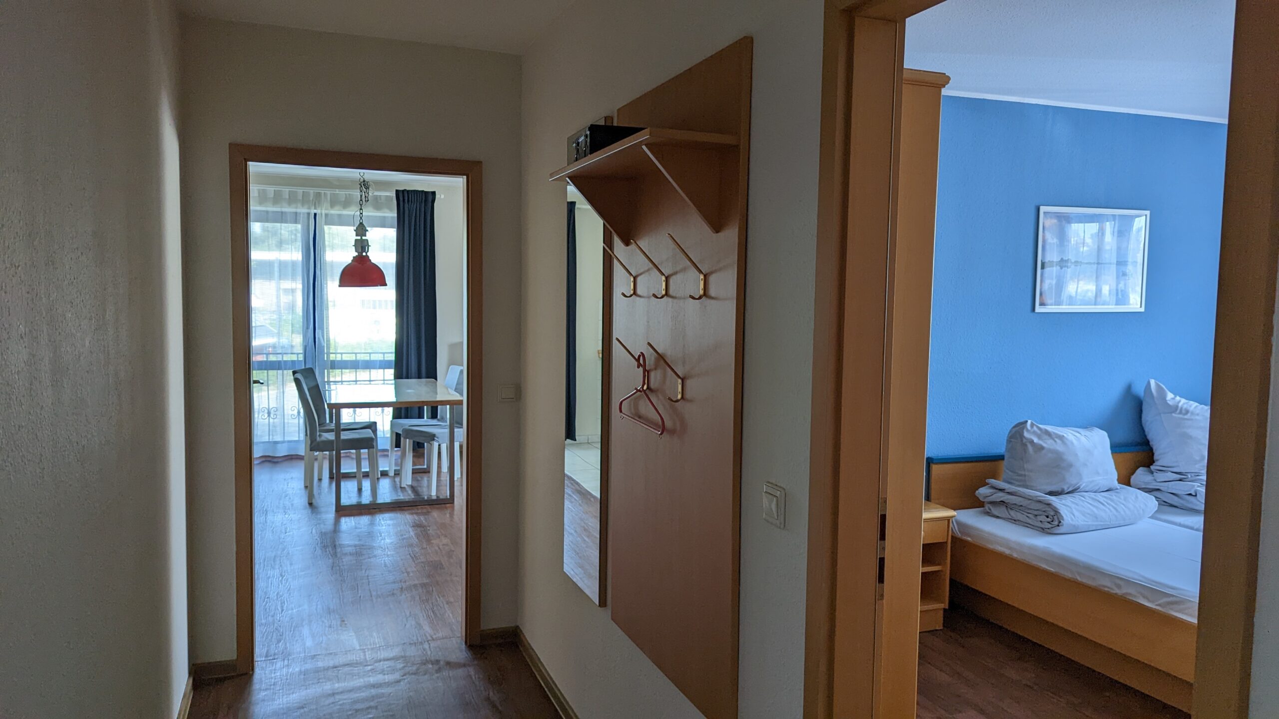 Das modern eingerichtete Apartment mit Blick auf den Ferienpark verfügt über ein Schlafzimmer, einen großzügigen Wohnbereich mit offener Küchenzeile sowie ein geräumiges Bad mit Dusche.